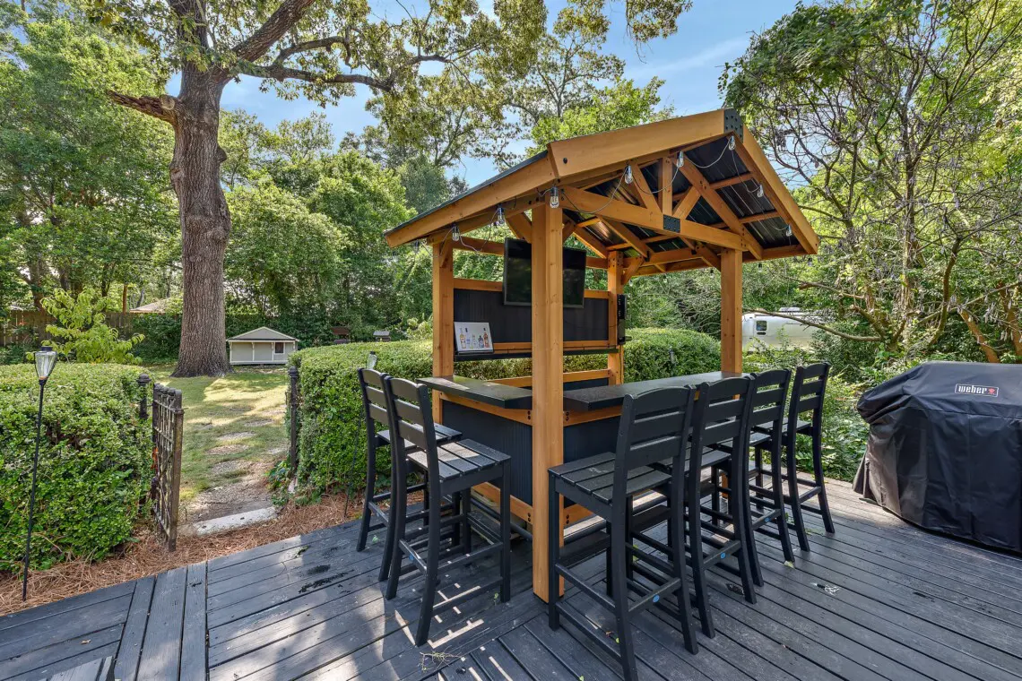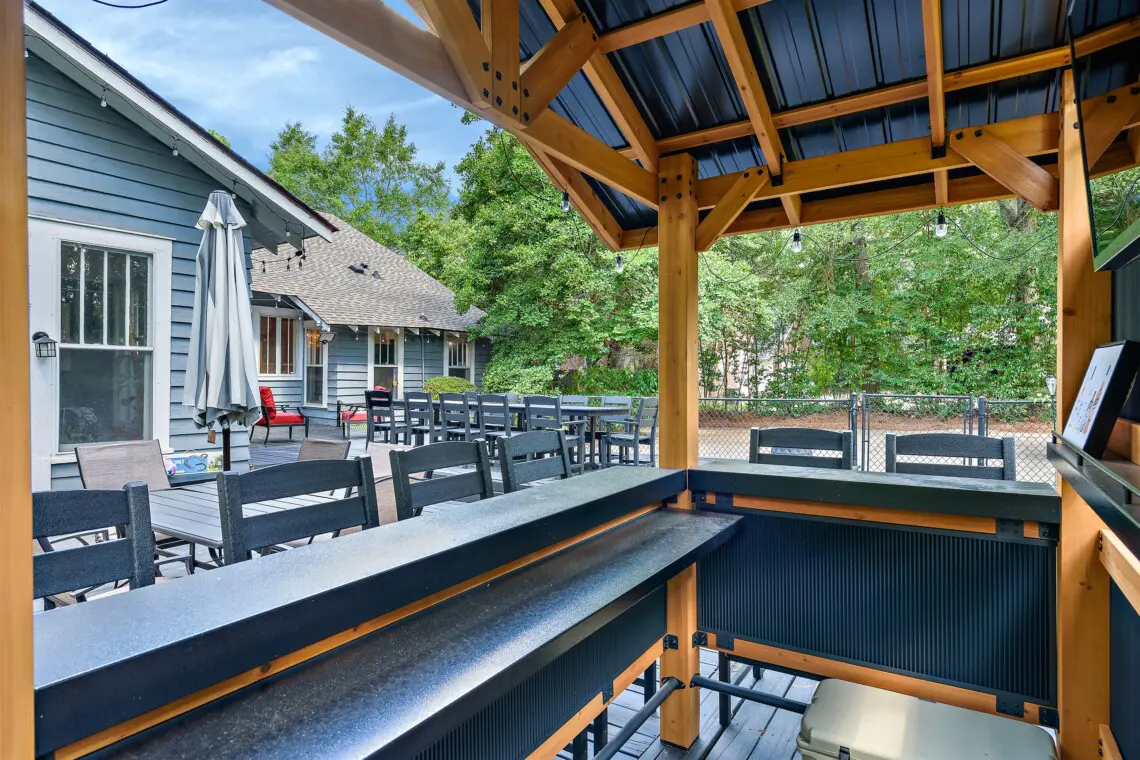 OUTDOOR LIVING: Dining tables for 12, porch w/ lounge seating, private backyard, outdoor bar